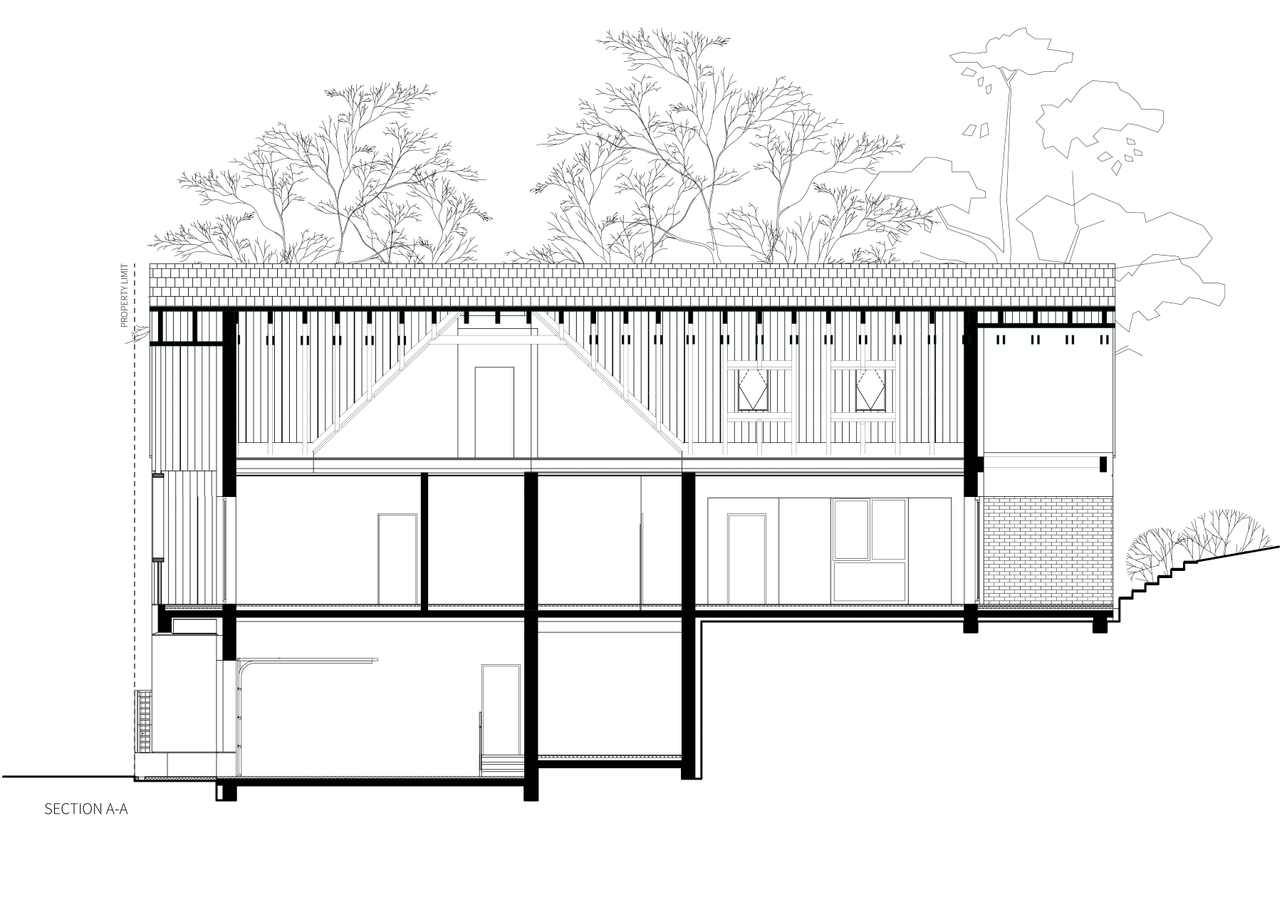 The house is carefully sited within its urban plot, with a modest front setback and landscaped buffers providing both privacy and a soft transition from street to interior. The restrained use of hardscaping and native planting creates a serene, low-maintenance outdoor environment.