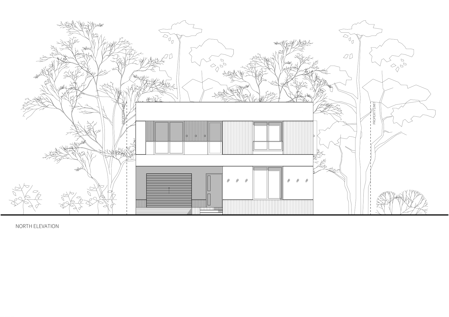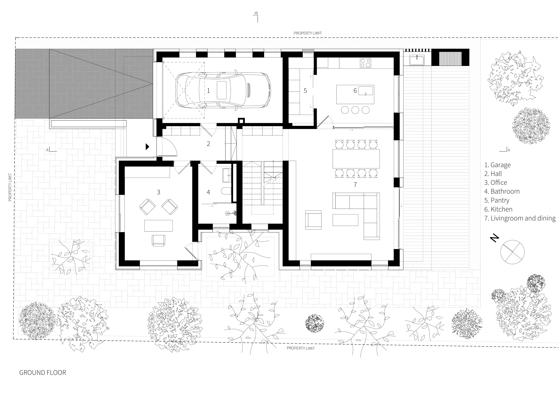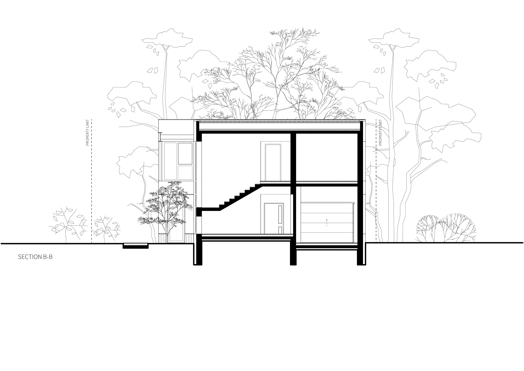 Nestled into its plot, the building maintains a low profile from the street while opening generously toward the backyard. The outdoor space is designed as an extension of the interior, featuring a partially covered terrace, a built-in outdoor fireplace, and a landscaped garden—ideal for quiet retreat or social gatherings.