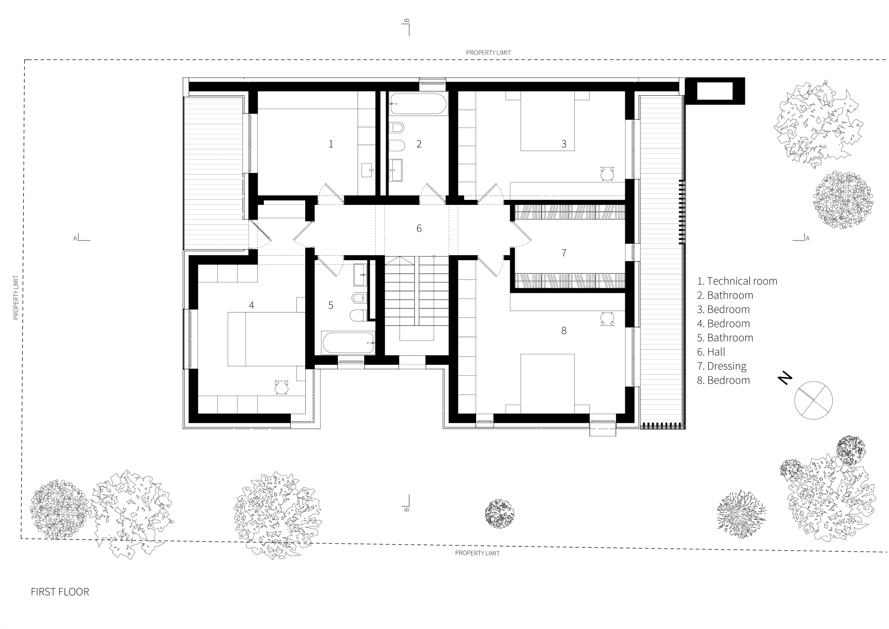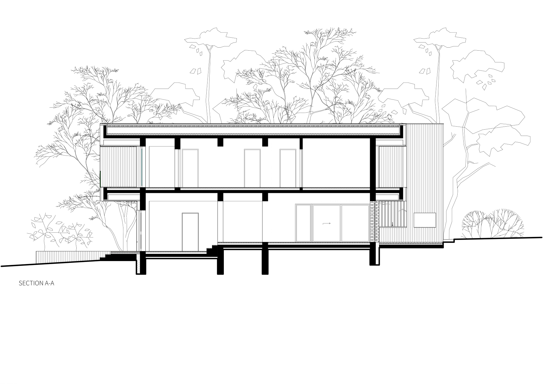 The spatial configuration unfolds over two levels, with public functions—living, dining, and kitchen—occupying the transparent ground floor. These open areas extend directly into the outdoor terrace and garden, blurring the boundary between interior and exterior. The ground floor is wrapped in glazing, allowing natural light to pour in while fostering visual continuity with the landscape. The upper level is more solid and protective, housing private functions such as bedrooms and bathrooms. A continuous balcony with wood-lined soffits adds warmth and frames panoramic views of the surrounding greenery, offering both intimacy and openness. Vertical circulation is positioned discreetly to maintain the purity of the plan and reinforce privacy between zones.