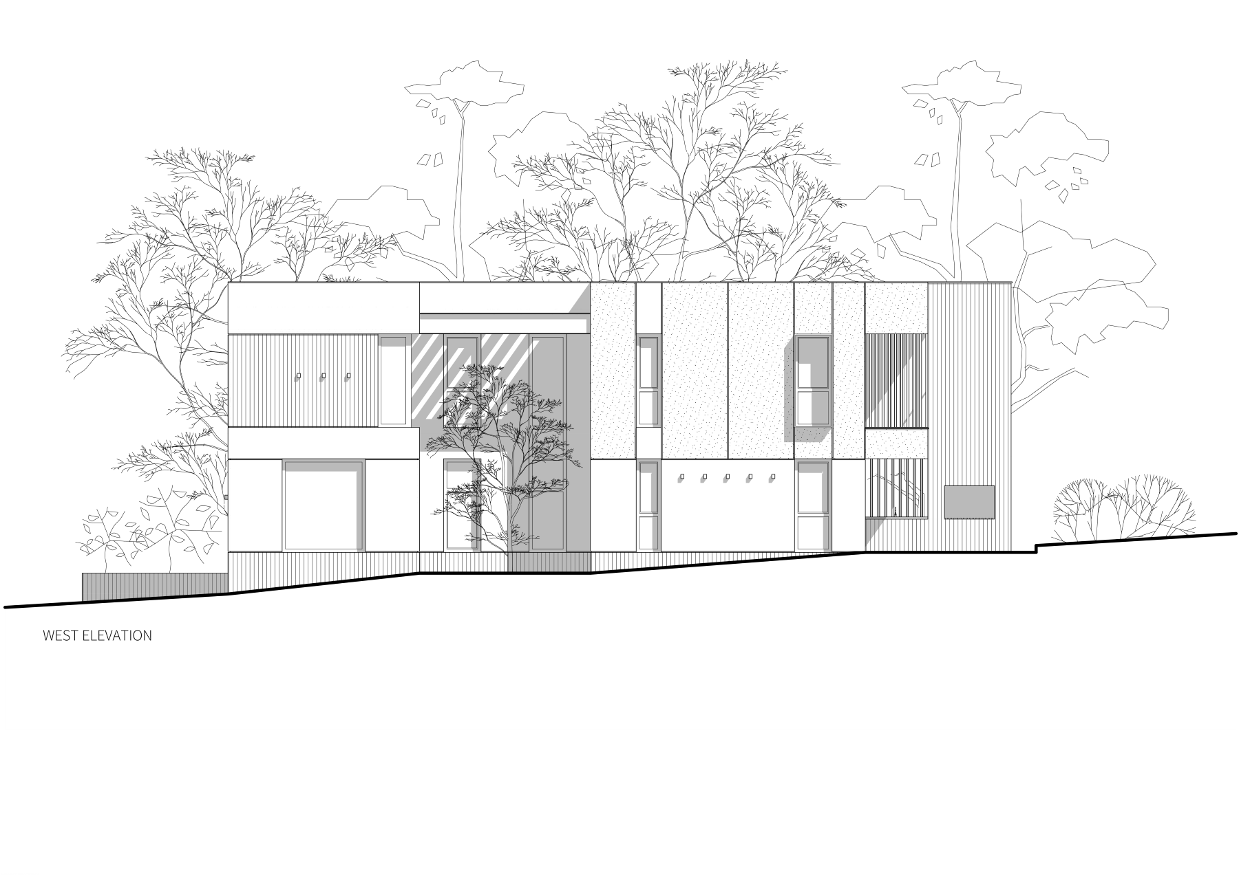 The house is conceived as a monolithic volume, defined by sharp edges and a predominantly horizontal rhythm. A restrained palette of dark textured concrete, natural wood, and reflective glass amplifies the sculptural quality of the building, while also anchoring it visually within its forested environment. The use of vertical slats and recessed elements on the façade introduces rhythm and privacy while softening the massing. Strategic openings and cantilevered overhangs enhance the architectural tension, creating dynamic relationships between solid and void, light and shadow.