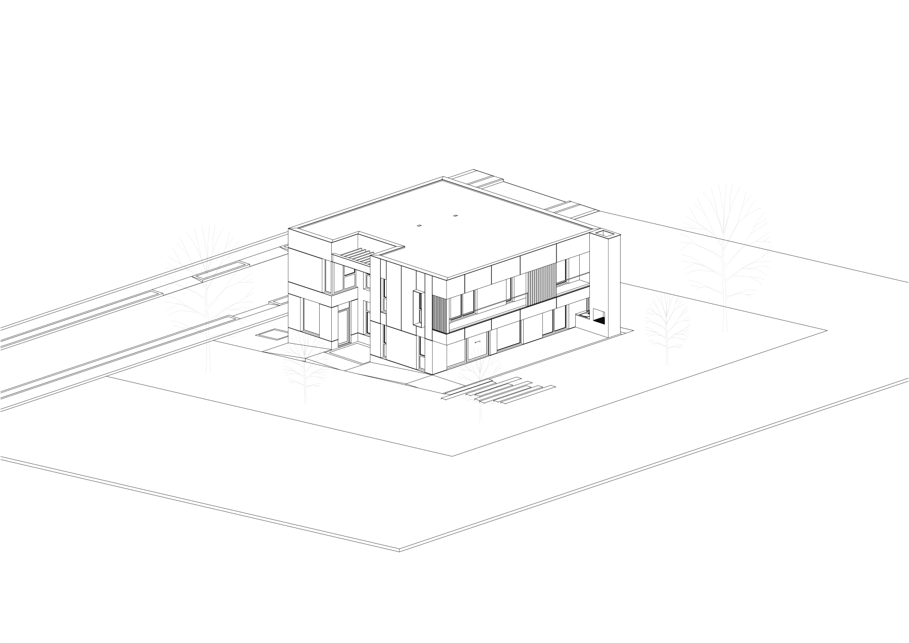 Nestled into its plot, the building maintains a low profile from the street while opening generously toward the backyard. The outdoor space is designed as an extension of the interior, featuring a partially covered terrace, a built-in outdoor fireplace, and a landscaped garden—ideal for quiet retreat or social gatherings.